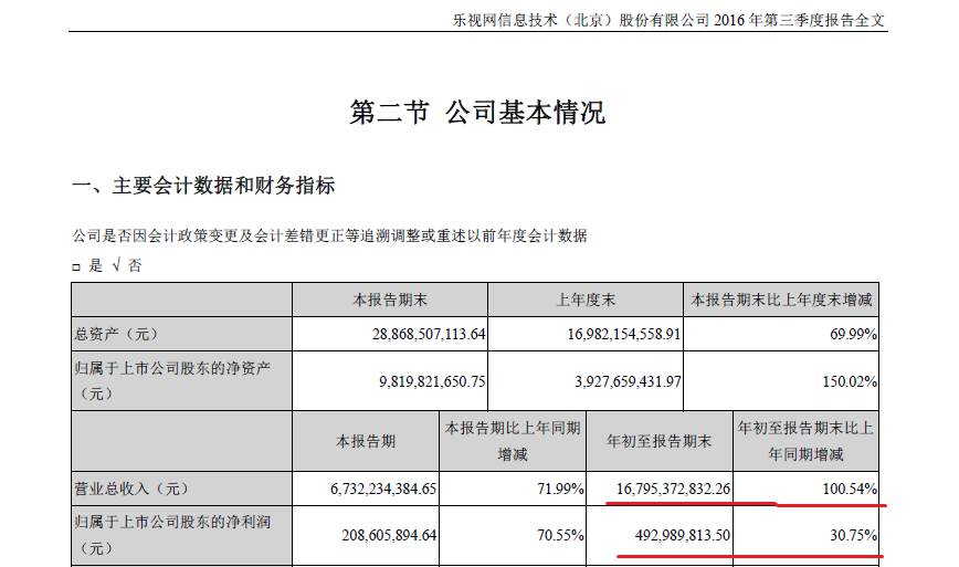 2016年前三季度,乐视网营业总收入高达167.95亿元,同比增幅超过100%;归属于上市公司股东的净利润约为4.93亿元,和2015年前三季度相比,涨幅接近31%。