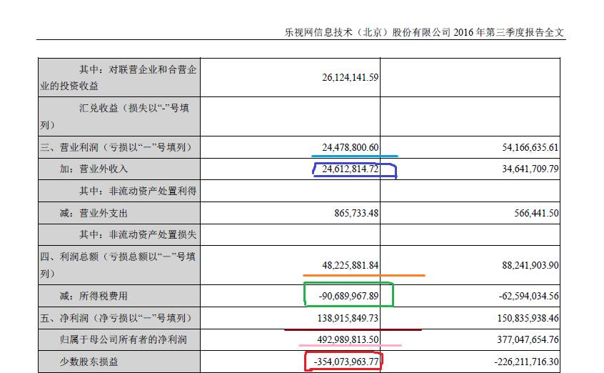 第三步:2016年前三季度,乐视网少数股东损益巨亏3.54亿元,基于此,乐视网归属于上市公司股东的净利润高达4.93亿元(3.54+1.39)。