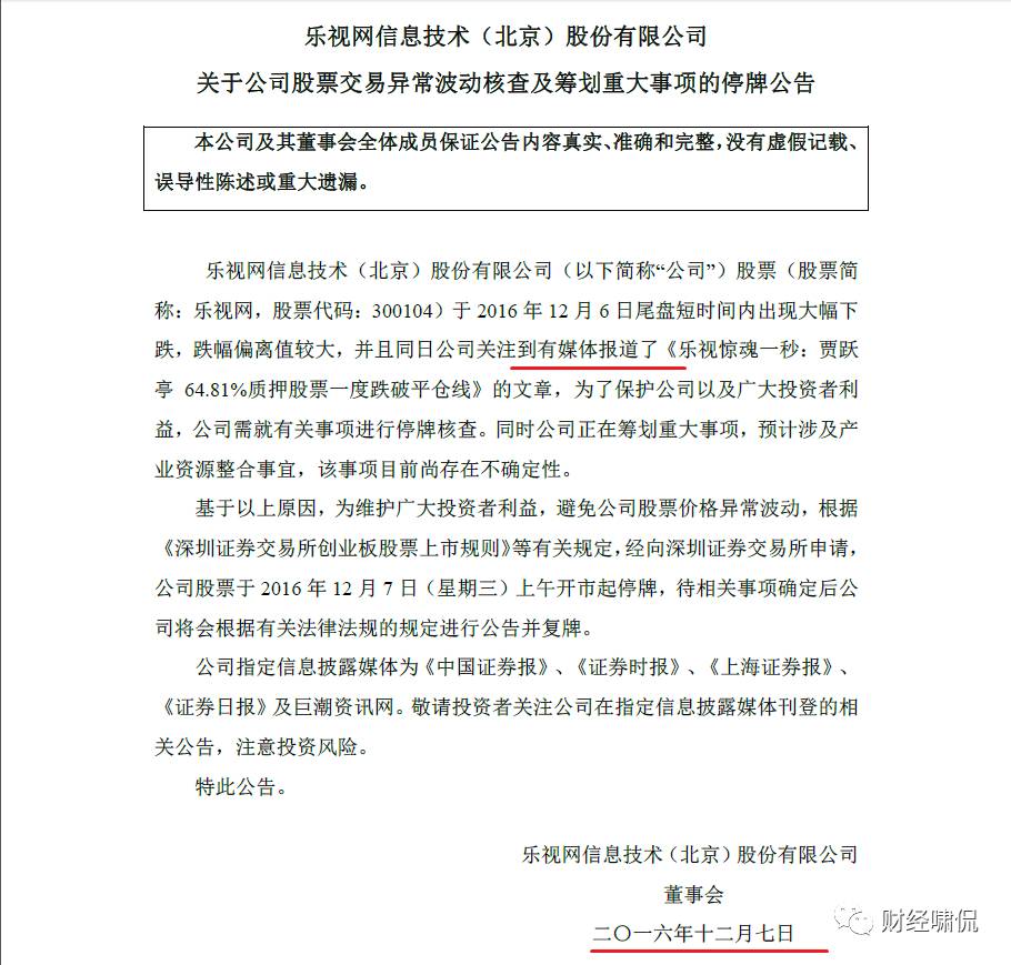 12月7日开市前,乐视网(300104.SZ)在深交所发布公告称,公司股票于 2016 年 12 月 6 日尾盘短时间内出现大幅下跌,跌幅偏离值较大,并且同日公司关注到有媒体报道了《乐视惊魂一秒:贾跃亭 64.81%质押股票一度跌破平仓线》的文章,为了保护公司以及广大投资者利益,公司需就有关事项进行停牌核查。
