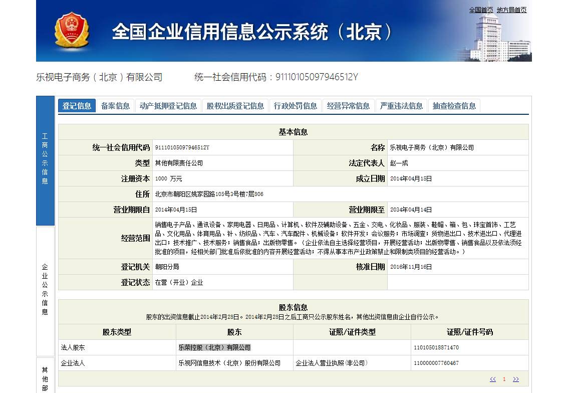 全国企业信息信用公示系统显示,乐视电子商务(北京)有限公司注册资本1000万元,有两位法人股东,分别是乐荣控股(北京)有限公司和乐视网,持股比例各为70%和30%。