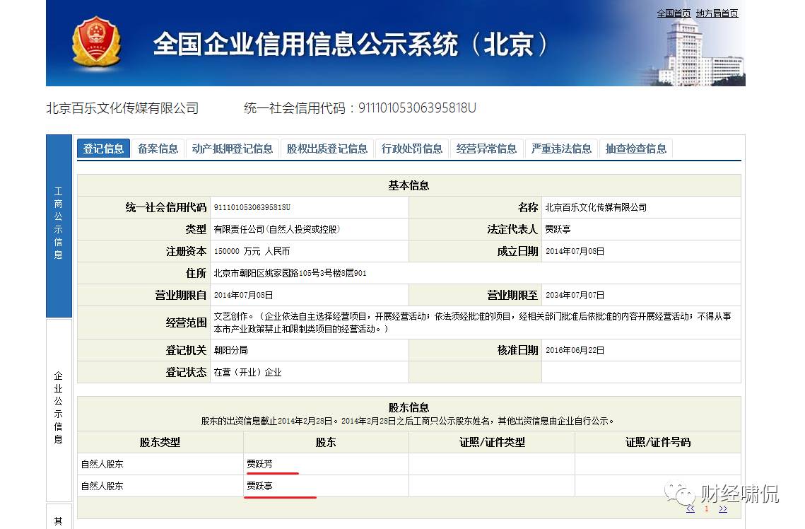 北京百乐文化传媒有限公司只有两位自然人股东,分别是贾跃亭和贾跃芳;公开资料显示,贾跃芳就是贾跃亭的姐姐。