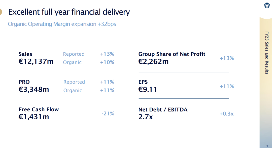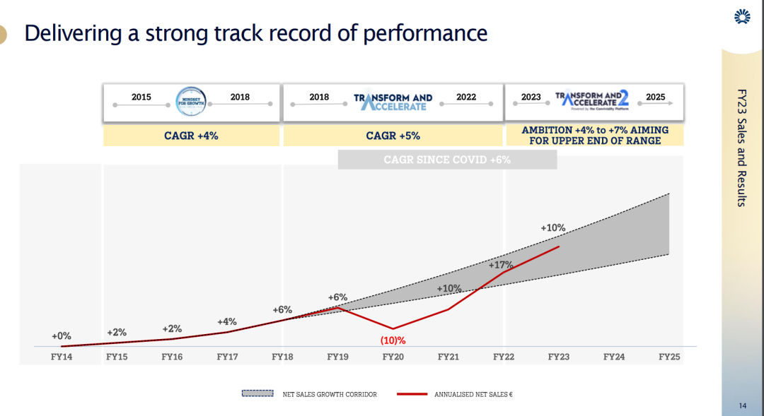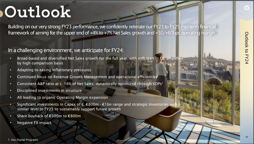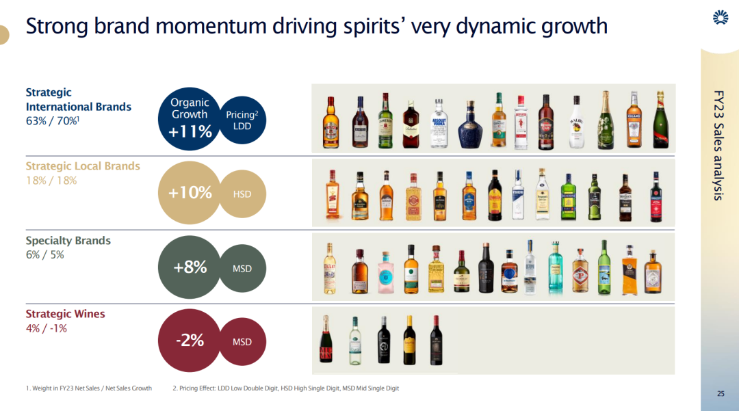 基于非常强劲的2023财年业绩,保乐力加重申其2023财年至2025财年中期财务框架,目标是实现4%至7%区间内较高水平的净销售增长,以及营业利润率上涨50/60个基点。
