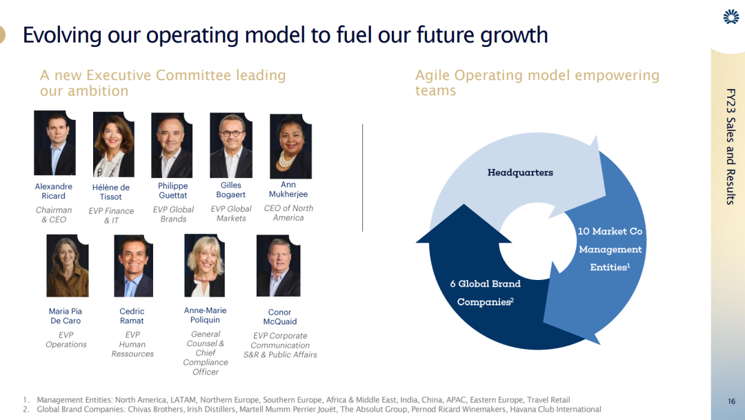 保乐力加指出,这主要带来两大变化。第一,强化公司治理,确保更高效的参与和更快的决策。具体而言,将采用新的执行委员会(Executive Committee)取代原有的执行董事会。新的执行委员会由9个职位组成,包括全球品牌执行副总裁、全球市场执行副总裁、北美首席执行官和全球运营总监等。