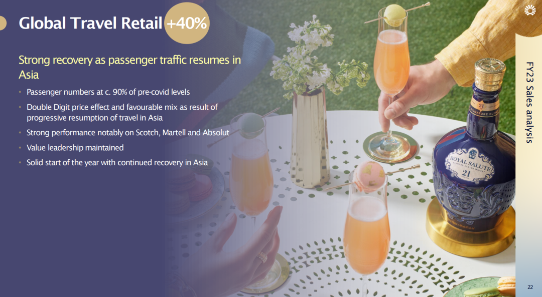 中国出行的复苏也给保乐力加的全球旅游零售业务注入了新活力。根据业绩资料显示,2023财年,该业务正在持续正常化,并且随着亚洲游客流量的恢复,预计2024财年将继续强劲复苏。