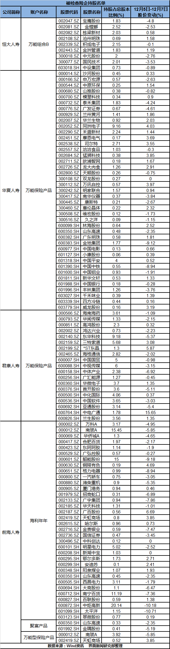 其余被检查险企其万能险业务的命运是否会像前海人寿一样,还要看公司的整改情况。根据Wind资讯最新数据,界面新闻梳理出这5家被检查险企万能险账户所持股票,投资者注意防范风险。