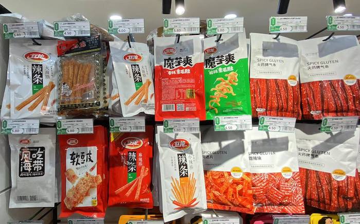界面新闻记者走访北京某超市获悉,卫龙袋装产品价格在4至6元之间,其中大面筋106g、卫龙魔芋爽50g、卫龙亲嘴豆皮65g的标价均接近6元。