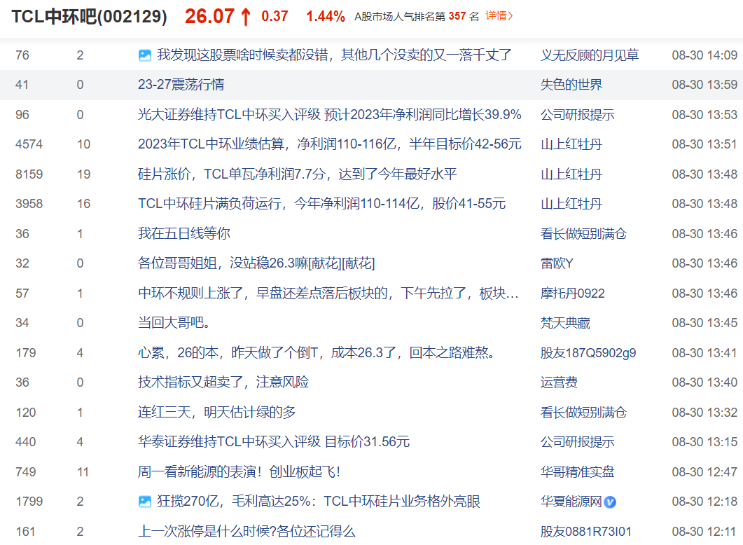 TCL中环股价在2022年三季度、2023年4月7日曾有一波40元/股以上的行情,之后持续处于下跌态势,目前也已经跌至26.07元/股,市值1054亿元。