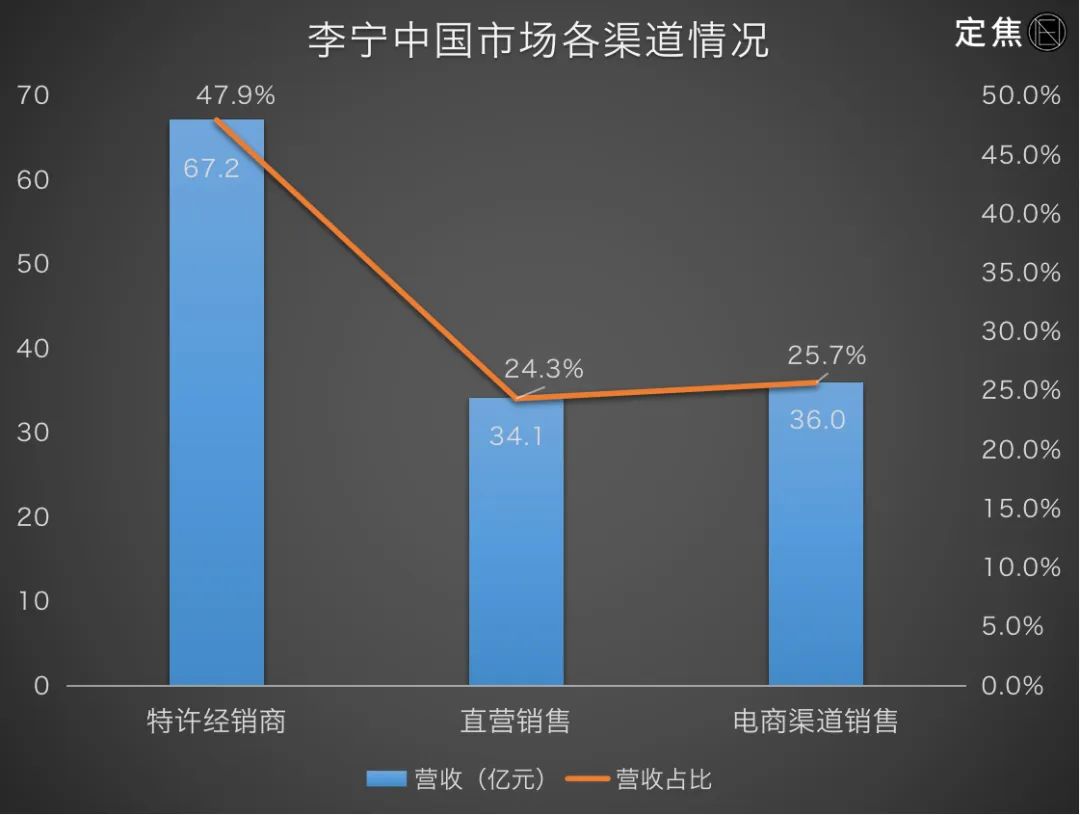李宁和安踏都在经销转直营,不过,一位经销商告诉「定焦」,李宁转直营的态度没那么彻底,需要的时间更长。目前,李宁依然有约半数收入来自经销渠道。