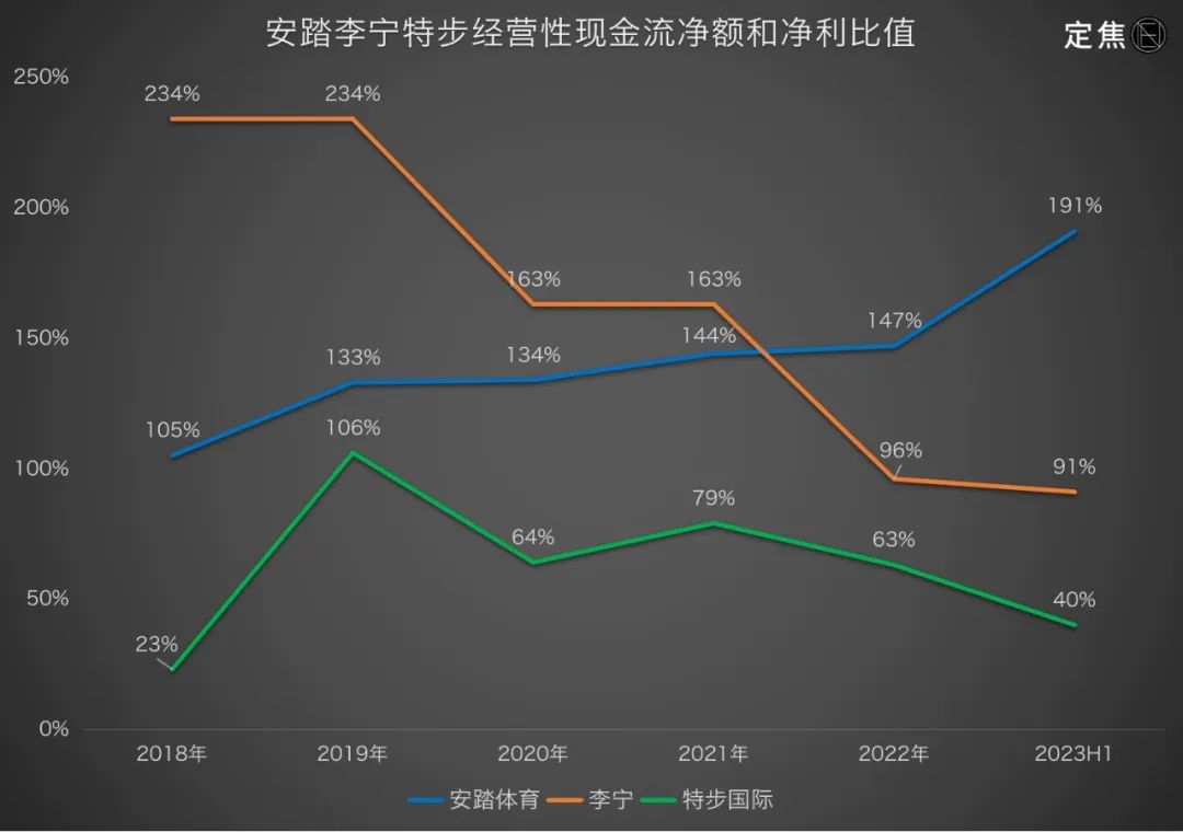 今年上半年,安踏该指标进一步上升到191%,在头部品牌中处于高位,说明在去库存周期中,安踏的经营现金流在改善,销售商品花出去的现金流少,收到的现金流多,公司在产业链中有比较强的话语权;相比之下,李宁为91%、特步为40%。