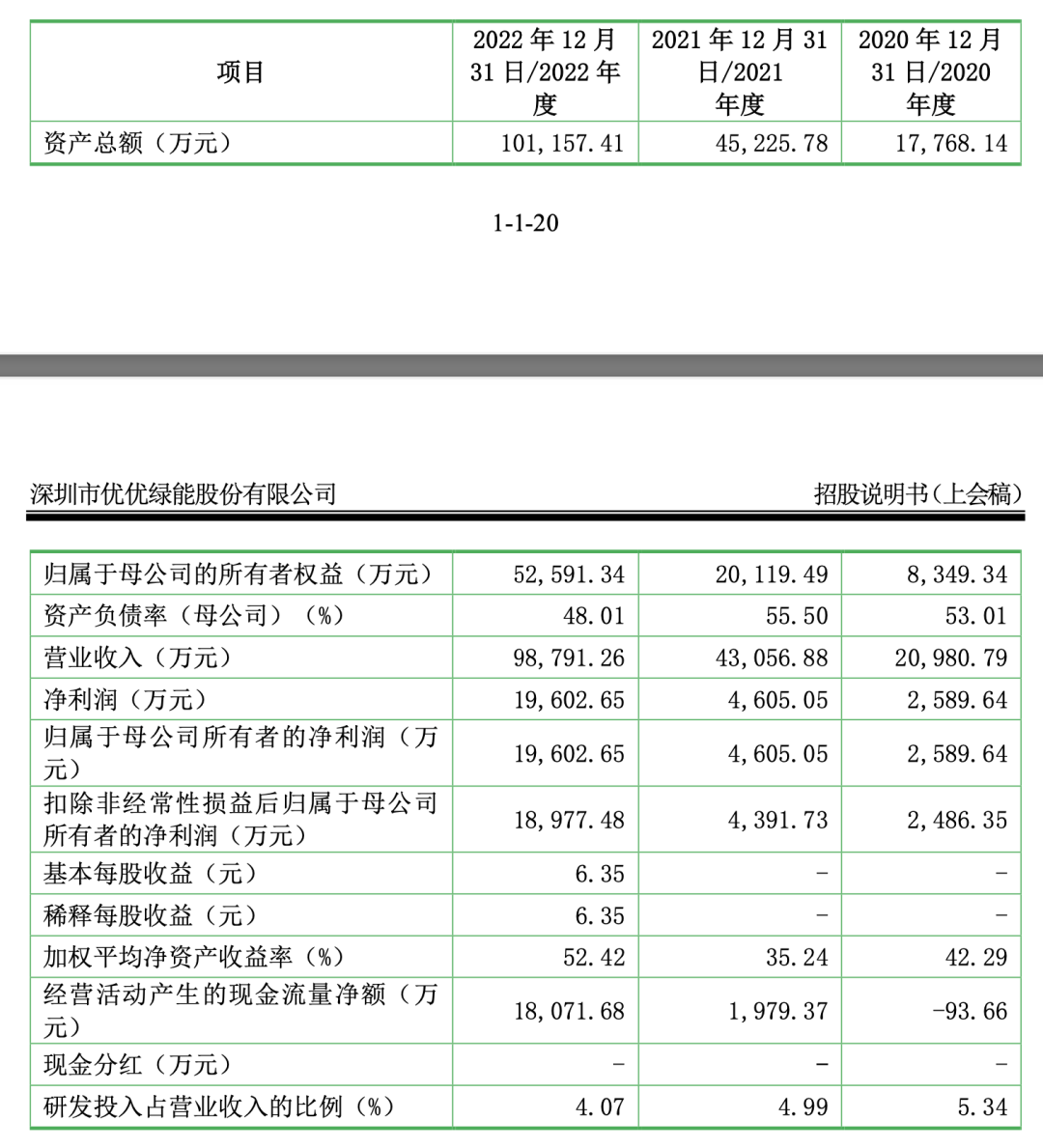 招股书显示,2020-2022年,优优绿能营业收入分别为2.10亿、4.31亿、9.88亿元,复合增长率达116.99%;净利润及归母净利润分别为2589.64万、4605.05万、1.96亿元;扣非归母净利润分别为2486.35万、4391.73万、1.90亿元。