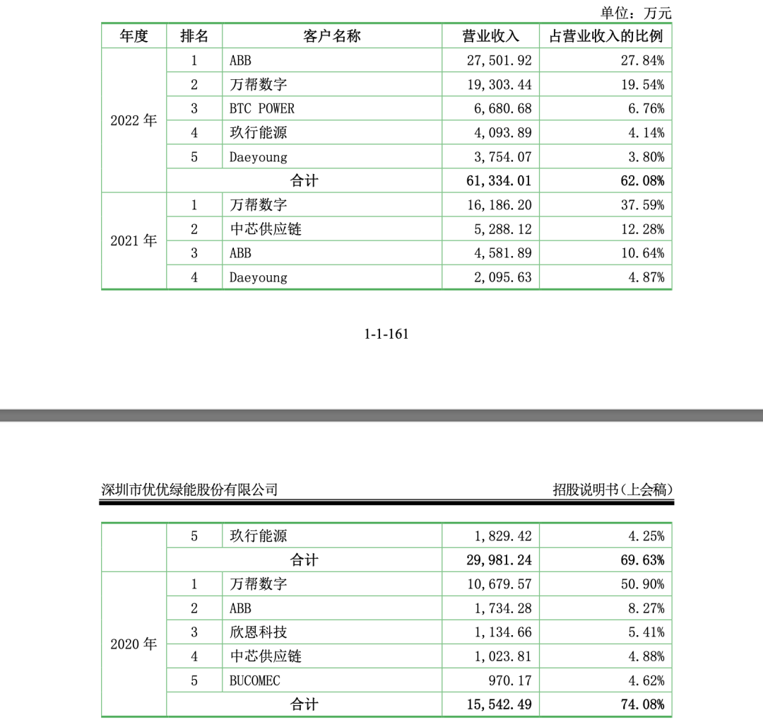 报告期内,优优绿能向前五大客户的销售收入分别为1.55亿、3.00亿、6.13亿元,占营业收入比例分别为74.08%、69.63%、62.08%。