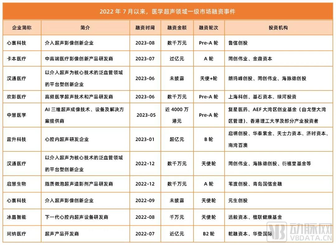 值得一提的是,仅在今年5-8月,中慧医学、欢影医疗、汉通医疗、卡本医疗、心寰科技便相继拿下数千万,甚至上亿元的融资,医学超声赛道呈现出一月一融的密集态势,在当下低迷的投资环境里显得尤为火热。