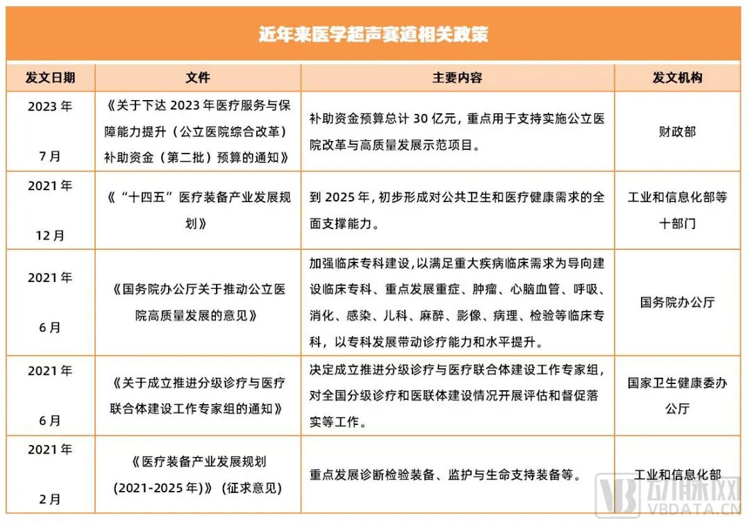 在政策端,国产替代与分级诊疗等相关政策的持续推进,更为医学超声设备市场迭代更新带来助力。以《政府采购进口产品审核指导标准(2021年版)》为例,该文件就明确了政府/事业单位采购国产医疗器械及仪器比例:便携式彩色超声诊断仪、彩色多普勒超生诊断仪、自动乳腺超生诊断仪等要求100%国产,彩色多普勒超生诊断仪(具备手术定位引导或心脏超声)要求国产占比50%。从这看,国产替代的空间很大。