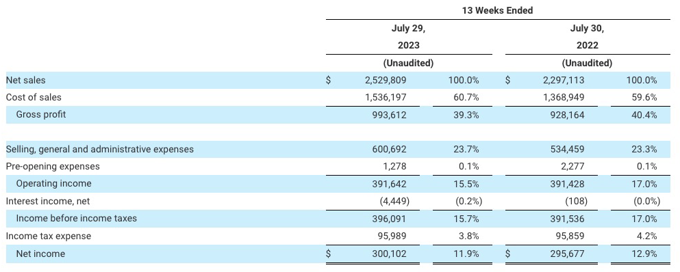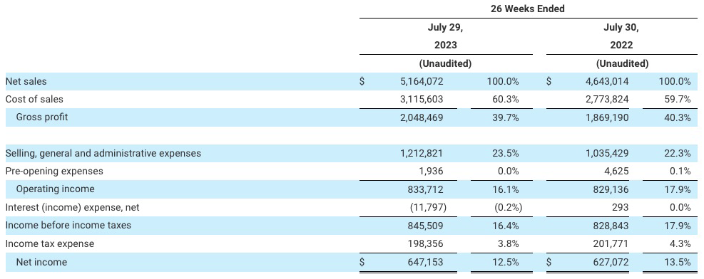 按半年算,截至2023年7月29日的半年,Ulta净销售额从上年同期的46亿增加到52亿美元(约合人民币377亿元),同比增速为11.2%。Ulta表示,净销售额增加主要是由于可比销售额增加、新店业绩强劲以及其他收入增加。