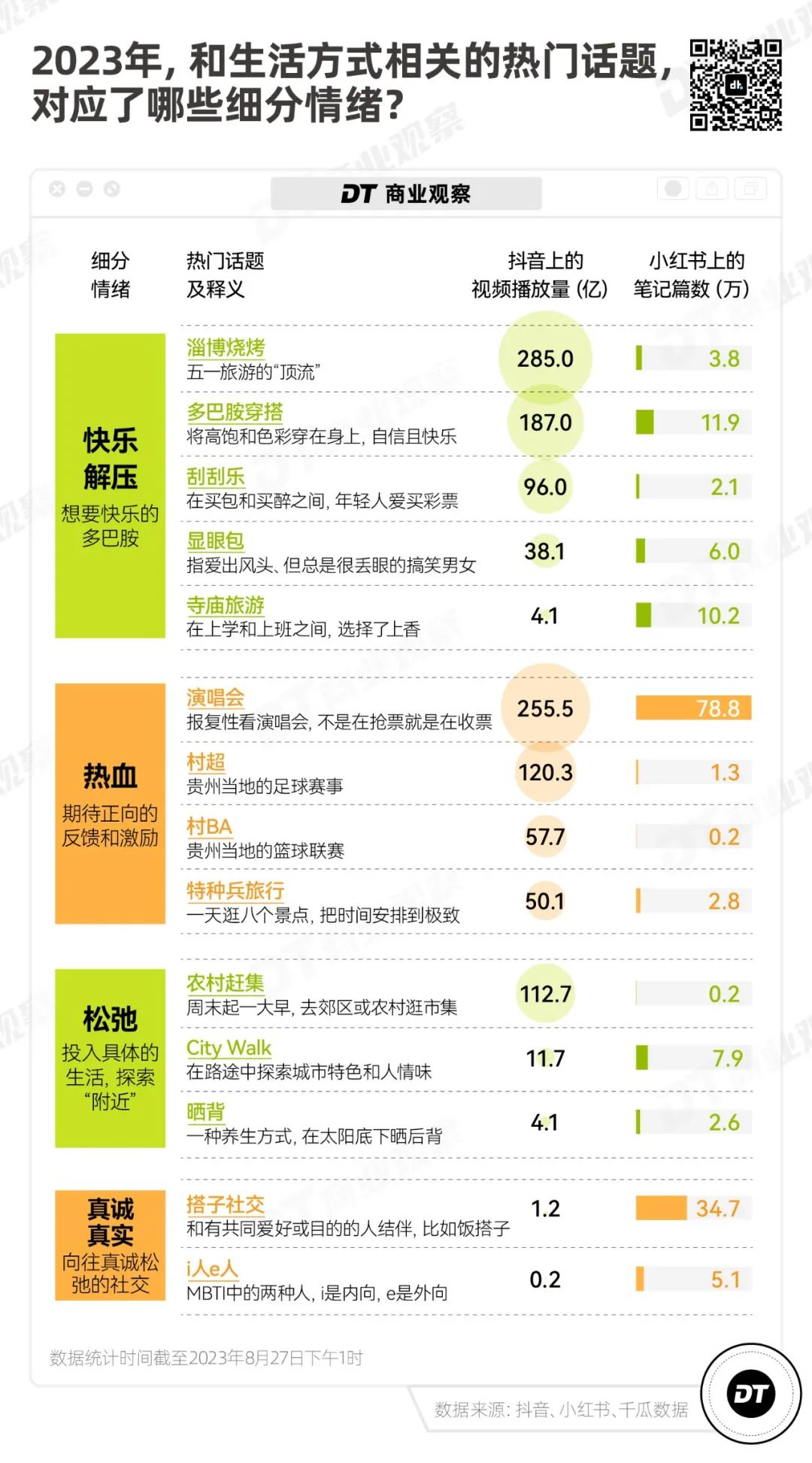 《DT商业观察》参考短视频和生活社交平台的热度,梳理了今年跟年轻人生活方式有关的热门关键词和事件,并总结出年轻人的四种细分情绪——快乐解压、热血、松弛和真实。