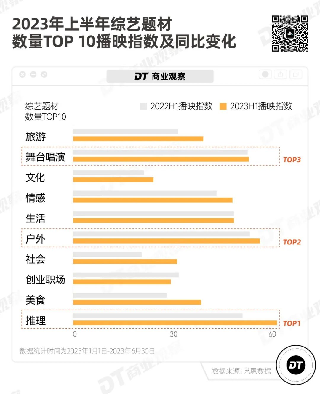 第三方平台艺恩数据发布的《2023 H1综艺市场研究报告》,也和腾讯视频得出的结论相似。今年上半年中,推理、户外和舞台唱演,是播映指数最高的3个综艺题材,也就是观众最喜欢的3个综艺题材。