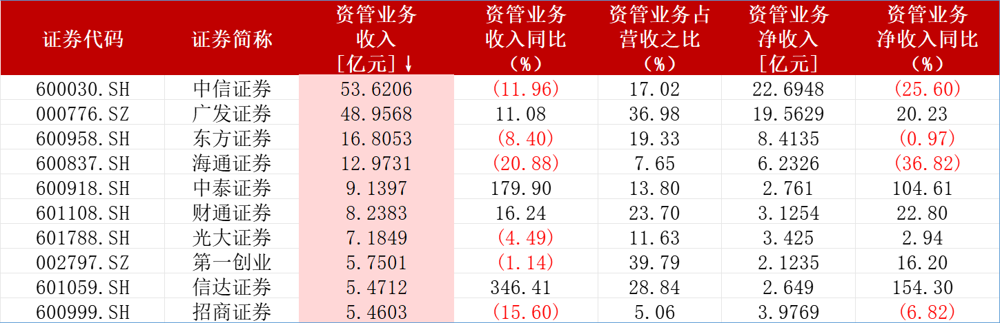 资管收入排名第二和第五的广发证券、中泰证券实现了资管业务收入的同比正增长,二者上半年实现资管业务收入48.96亿元和9.14亿元,增速分别达到11.08%和179.90%。