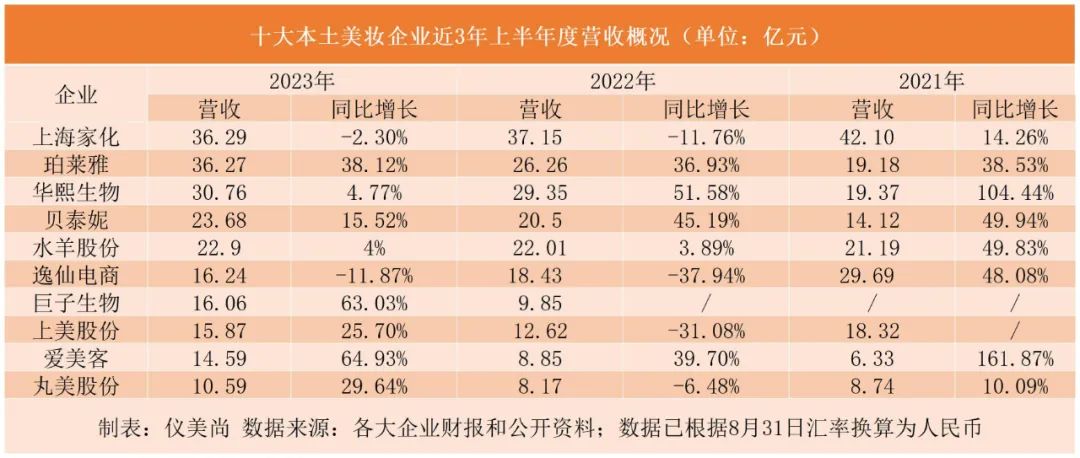 此外,一个新的变化是,在2022年之前,只有上海家化一家企业的半年营收突破了30亿元大关。但今年,华熙生物和珀莱雅也都突破这一关口;去年上半年,有3家企业的营收没有超过10亿元。而今年,上述10家企业全都突破10亿元。