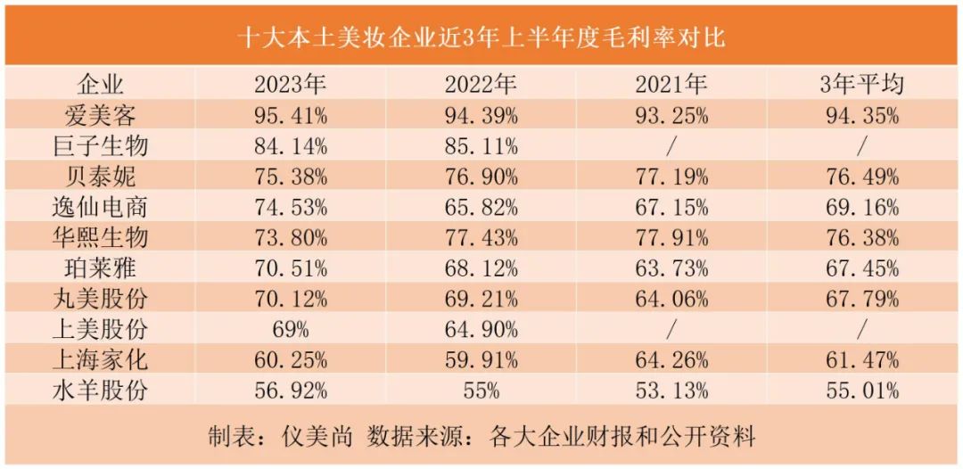 从最能反映美妆企业市场竞争力的毛利率来看,排名前三的企业为爱美客、巨子生物和贝泰妮,其毛利率分别为95.41%、84.14%和75.38%。