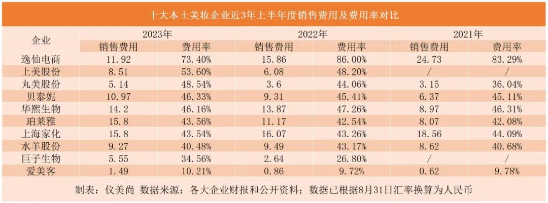 其中,销售费用率位居前三的企业分别是逸仙电商、上美股份和丸美股份,费用率分别为73.4%、53.6和48.54%。不过,逸仙电商与前两年相比,费用率有较大幅度下降。