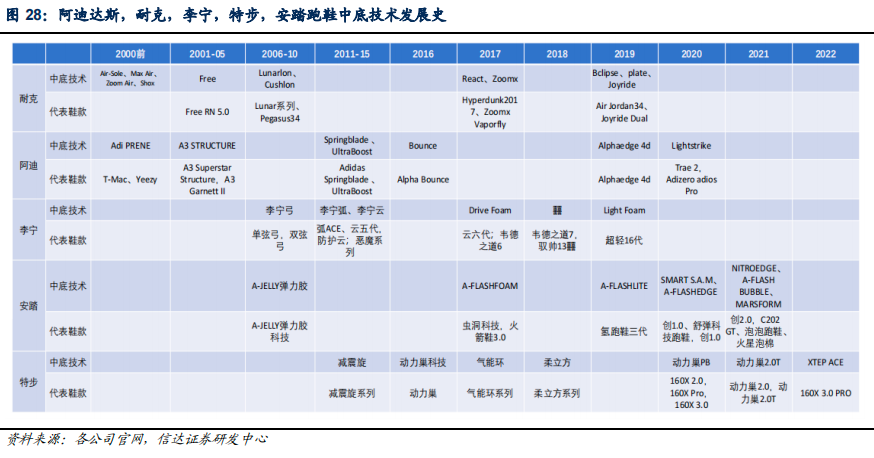 耐克、阿迪达斯、李宁、安踏、特步的跑鞋中底技术发展史,图源信达证券研发中心