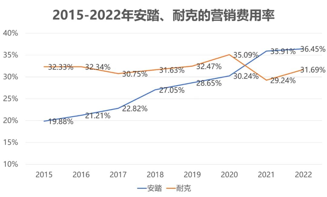 伴随大力度的营销投放和布局,安踏的营销费用率也逐年攀升。2015-2022年,安踏的营销费用率几近上涨了17个百分点,仅2021一年就上涨了5.67个百分点。对比狠砸钱做营销投放的安踏来说,耐克的营销费用率却高位回落,在2021年跌了5.85个百分点。