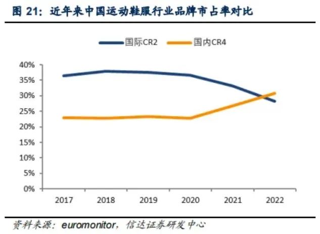 2017-2022年中国运动鞋服行业国内、国际品牌市占率对比,图源信达证券研发中心