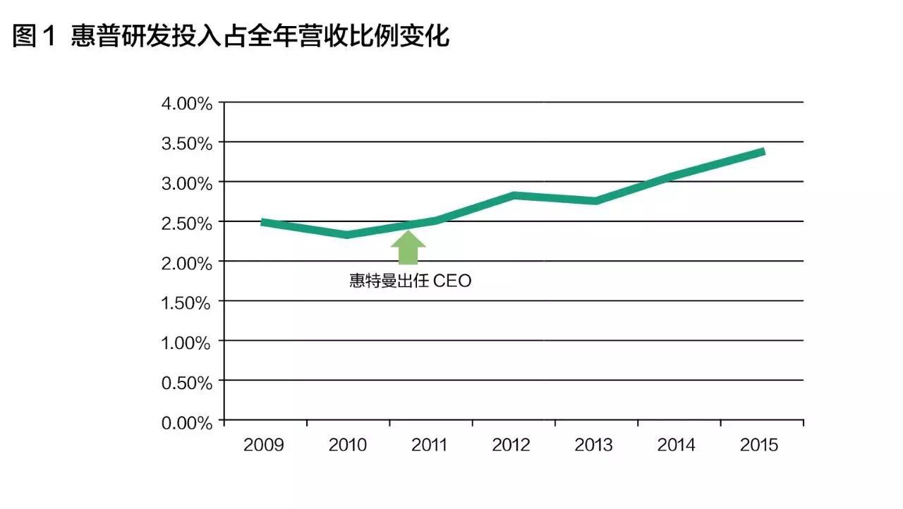 在惠特曼看来,惠普的核心文化是工程师文化,需要通过不断的研发投入磨出一个又一个新产品或者新技术。在上世纪两位创始人比尔·休利特(Bill Hewlett)和大卫·帕卡德(David Packard)经营惠普的年代,研发投入占全年营收的比例一度超过10%。进入本世纪,惠普在研发上的投入极速下降,从2000年的6%降到2010年最低的2.35%。惠特曼要做的就是加大研发投入(图1),重回“惠普之道”(The HP Way)。