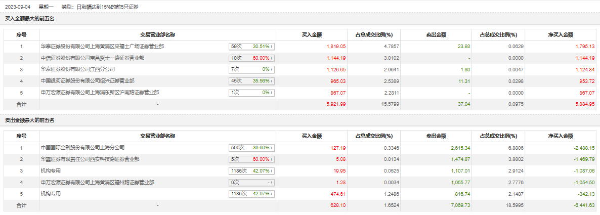 具体来看,机构买入494.56万元,卖出1923.75万元,合计净卖出1429.19万元。此外,知名游资现身龙虎榜,赵老哥(中国银河证券股份有限公司绍兴证券营业部)净买入953.72万元。此外,华泰证券上海黄浦区来福士广场证券营业部、中信证券南昌贤士一路证券营业部分别买入1819.05万元、1144.19万元;中国国际金融上海分公司、华鑫证券西安科技路证券营业部分别卖出2615.34万元、1474.87万元。