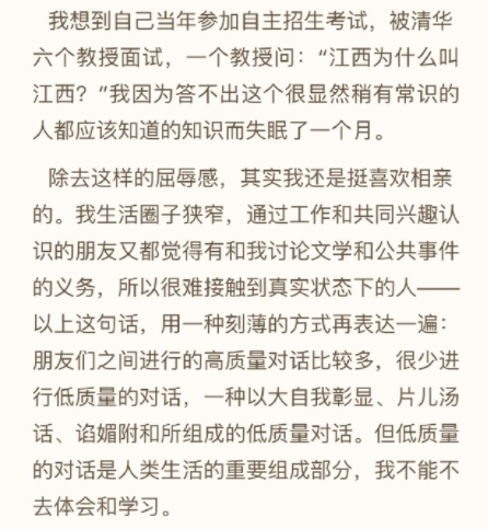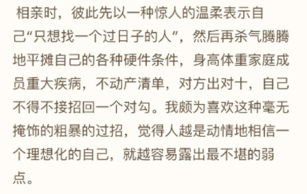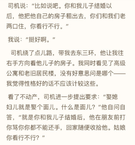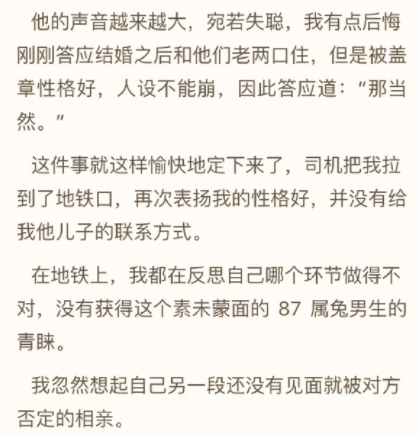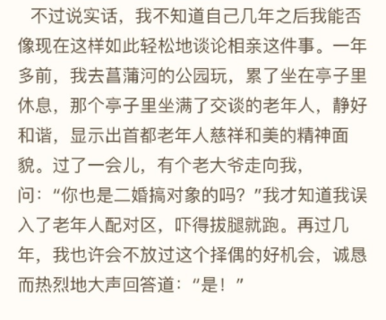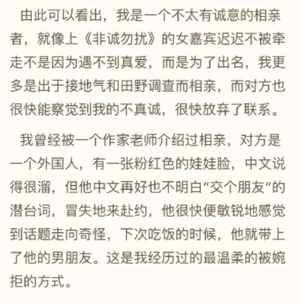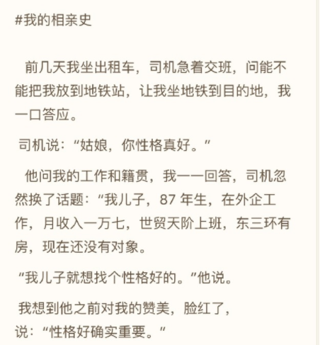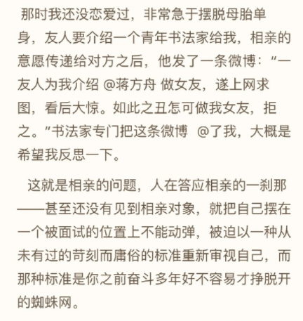 今天蒋方舟 老师在微博上分享了一段迷之尴尬地“相亲”经历。简要的说就是蒋老师坐出租车,司机觉得她人不错想介绍给儿子。最后连儿子的房都看了却没有给蒋老师联系方式。遂蒋老师写了一篇关于相亲的小文章,蛮有意思,也不长,可以看看: