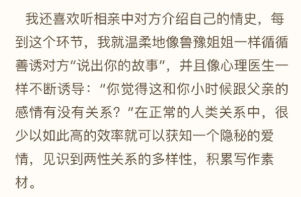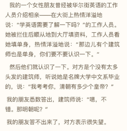 我一个极其反感相亲的人倒是对相亲时的知识问答环节很感兴趣 回答对了得意满满 答不出来懊悔不已 激起了我的胜负欲 可以搞一个相亲版的一站到底吗