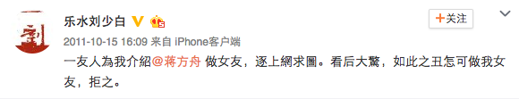 看蒋微博后,逐上网求博。看后大惊,如此之丑怎可妄谈“拒之”,实属不要脸