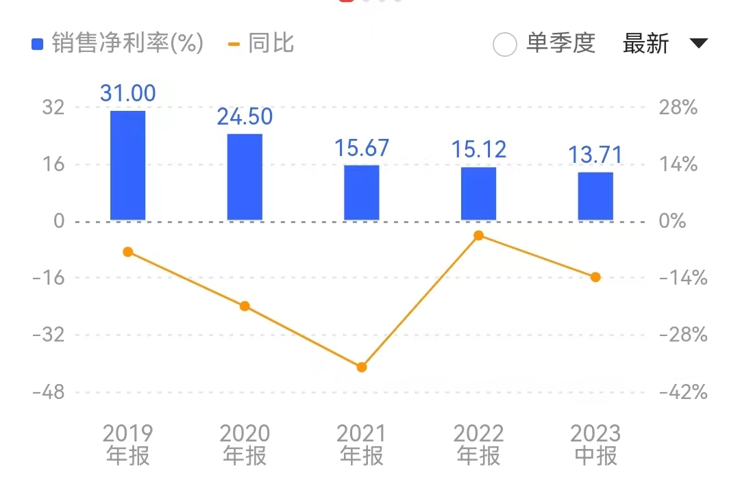 据同花顺数据,华熙生物今年上半年净利润率进一步下降至13.71%,对比历年年报数据来看,已经连续五年出现下滑,较2019年下降超过17.29个百分点。