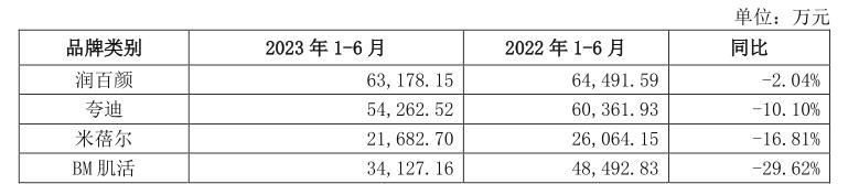 具体从营收的大头“功能性护肤品”来看,其中“润百颜”实现营收6.32亿元,同比下降2.04%;“夸迪”实现营收5.43亿元,同比下降10.10%;“米蓓尔”实现营收2.17亿元,同比下降16.81%;“BM肌活”实现营收3.41亿,同比下降29.62%。