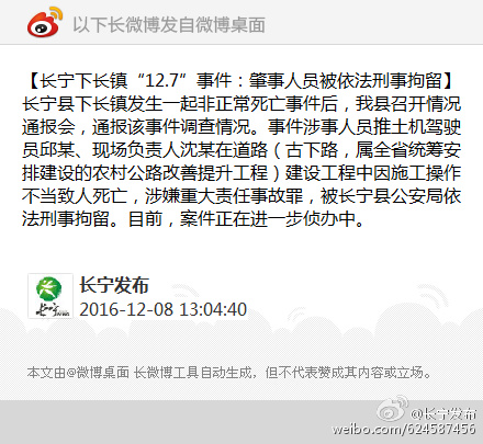 此前在7日晚长宁县曾在微博上通报此事称,12月7日,长宁县下长镇永利村发生一起非正常死亡事件。当日上午11时许,下长镇永利村修乡村公路,推土机驾驶员邱某在施工时将村民周某某埋于泥土中,导致其死亡。县公安局接警后,迅速赶到事发现场,将推土机驾驶员邱某、施工负责人沈某进行控制。事件发生后,长宁县立即成立“12.7”事件应急处置工作领导小组,全力开展事件调查和善后工作。