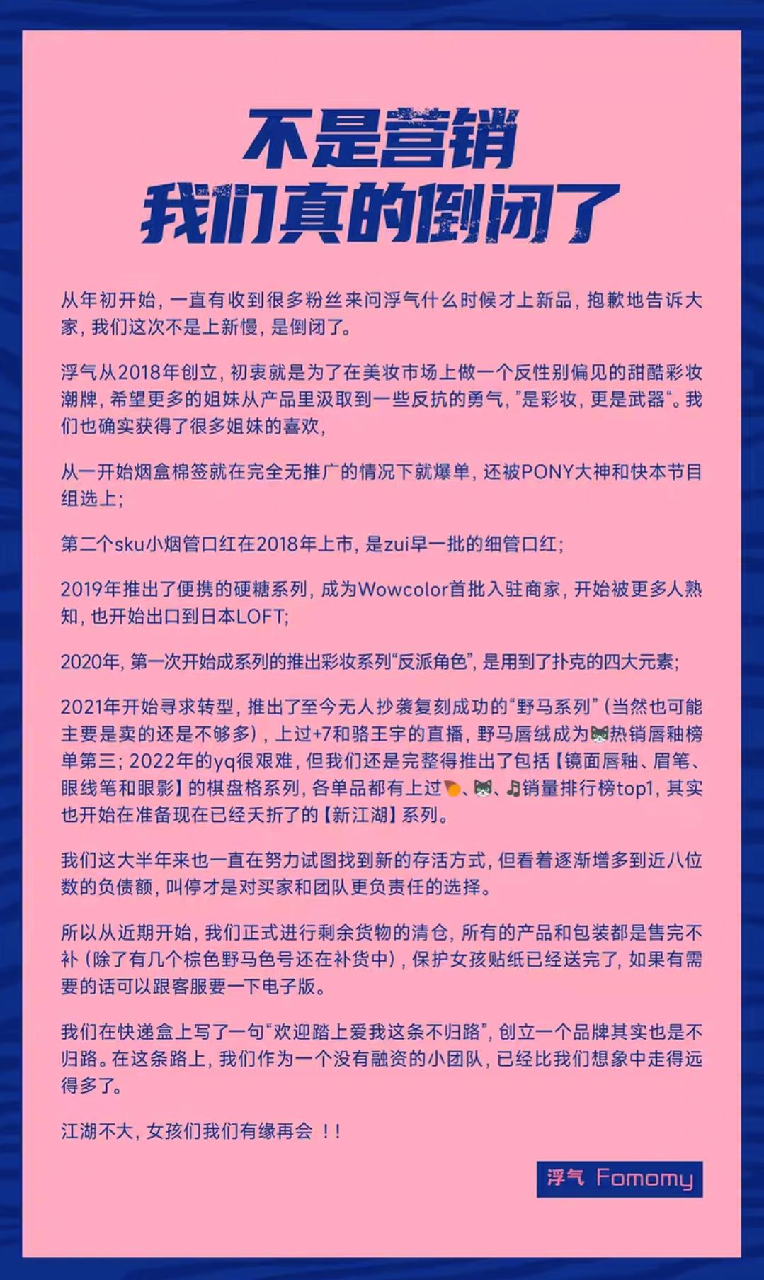 近日,浮气Fomomy在天猫旗舰店、小红书、微博等多个平台发布题为《不是营销 我们真的倒闭了》的公告。公告显示,对于今年以来粉丝对其何时上新品的疑问,浮气Fomomy表示,“我们这次不是上新慢,是倒闭了”。