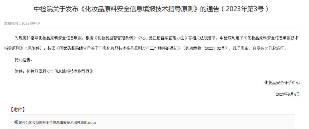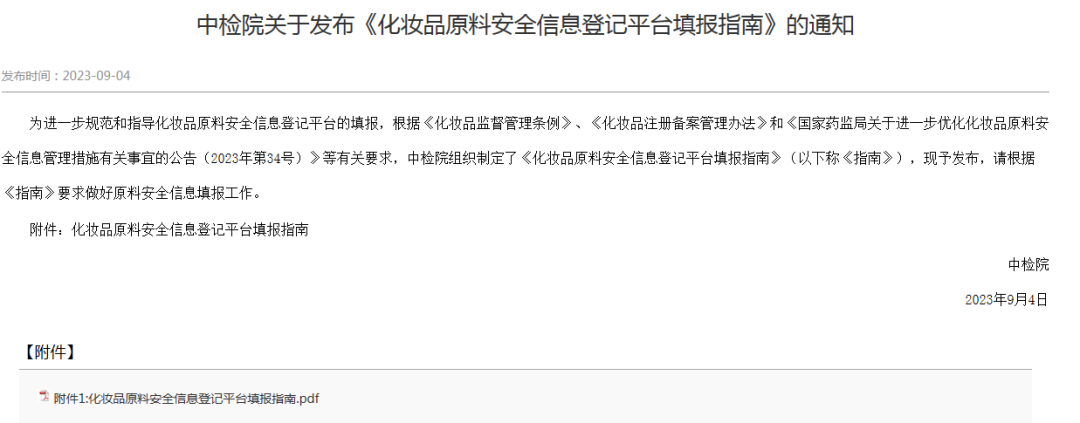 众所周知,根据国家药监局要求,自明年1月1日起,化妆品注册人/备案人需进行产品配方所使用全部原料的原料安全信息资料填报。随着这一重要政策节点的临近,今日(9月4日),中国食品药品检定研究院(下称“中检院”)发布了《化妆品原料安全信息填报技术指导原则》和《化妆品原料安全信息登记平台填报指南》,以规范和指导化妆品原料安全信息填报。