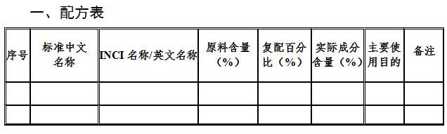 在《配方填报指导原则》中还给出了“配方表式样”,其中包含了配方成分的标准中文名称、INCI名称/英文名称、原料含量、复配百分、实际成分含量、主要使用目的、备注等多项信息。