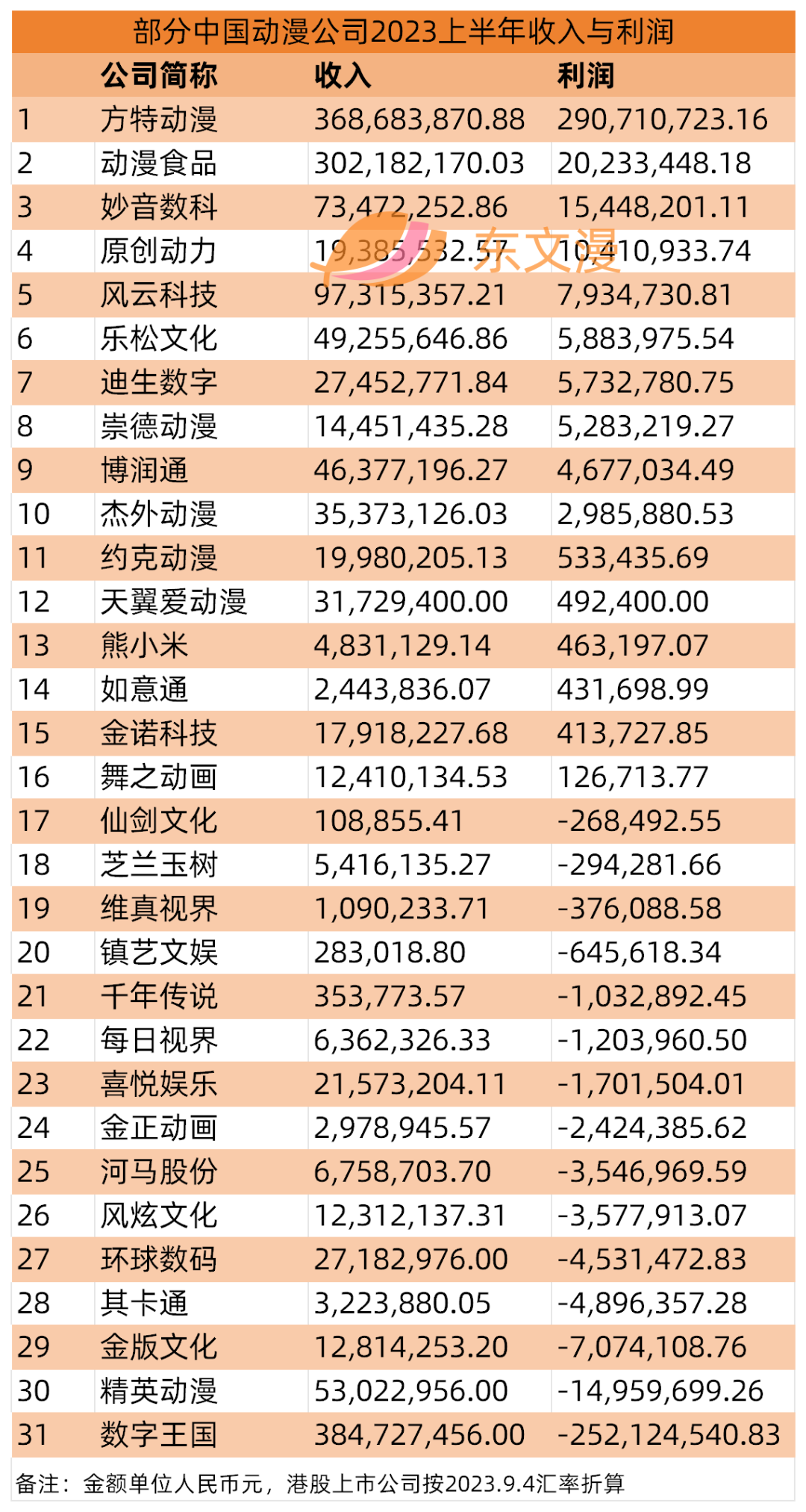 东文漫结合31家公司财务数字,以及光线传媒披露其投资的18家动漫公司动态,统计发现,2023上半年净利润在1000万元以上的主营业务包括动漫的公司有4家,分别是方特动漫、动漫食品、妙音数科、原创动力。