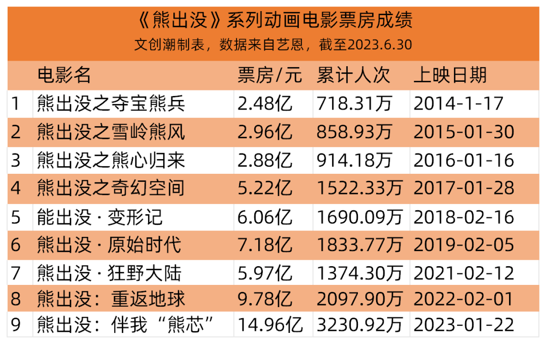 2023年1月22日上映的“熊出没”系列大电影第九部《熊出没·伴我熊芯》,票房达14.97亿,位居中国影史国产动画电影票房第三,系列电影总票房突破57亿。
