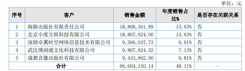 2022年,妙音数科的前五大客户分别为海豚出版社、百度视频(小度互娱)、深圳卓翼时空(抖抖云广告平台)、博润通和成都音像出版社。