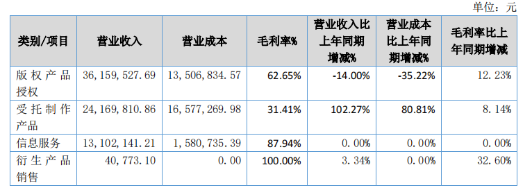 受托制作收入2416.98万元,同比增长102.27%,主要是由于承接的制作项目增加;