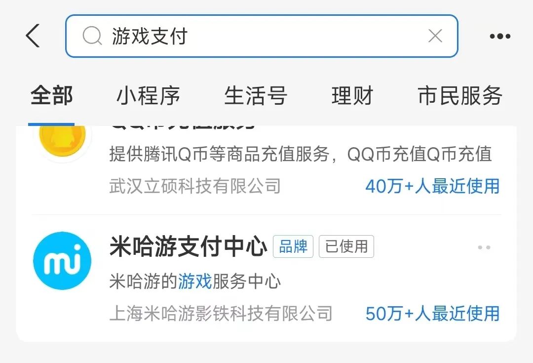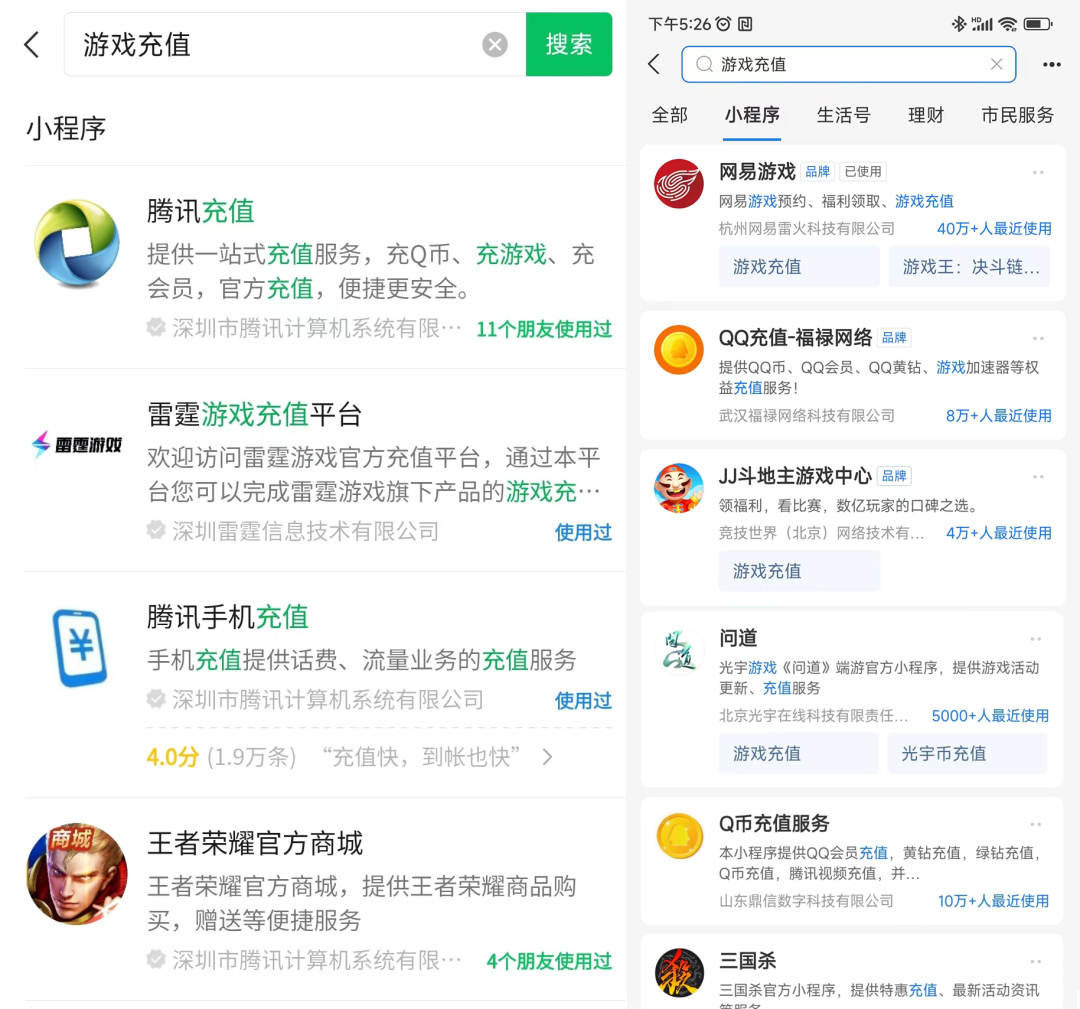 以小程序支付,支付宝里开通的游戏,目前有《问道》、《三国杀》、《JJ斗地主》、网易游戏、贪玩游戏、网龙、紫龙。而在微信里,则有“腾讯充值”、《王者荣耀》、“雷霆游戏充值平台”、“冰川充值”等游戏充值小程序。(下图,左为微信小程序,右为支付宝小程序)