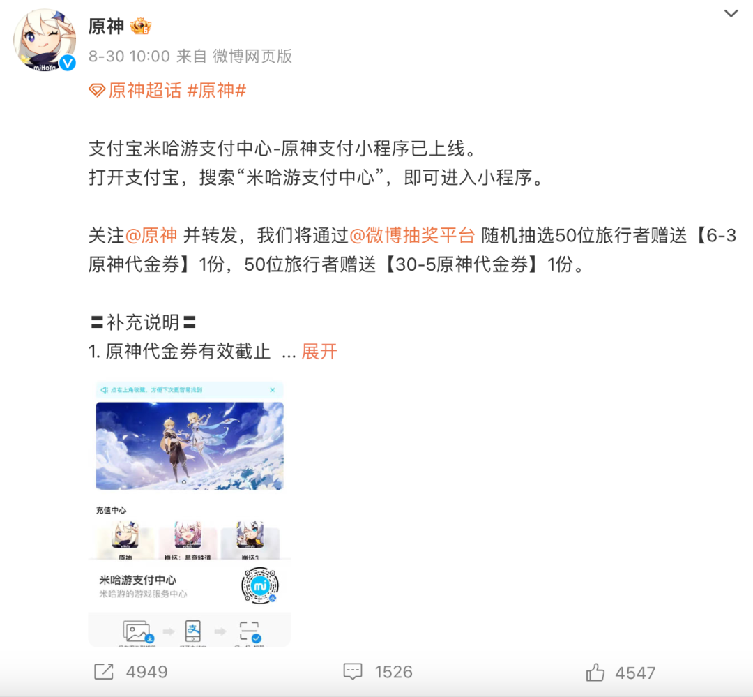 8月30号,@原神、@崩坏3、@崩坏星穹铁道三个微博官方账号一同发文:支付宝米哈游支付中心上线,打开支付宝App,搜索“米哈游支付中心”,即可进入小程序。DataEye研究院发现:该小程序只可以充值官服,不能充渠道服,充值获得的游戏币与游戏内部充值所获,是一致的。