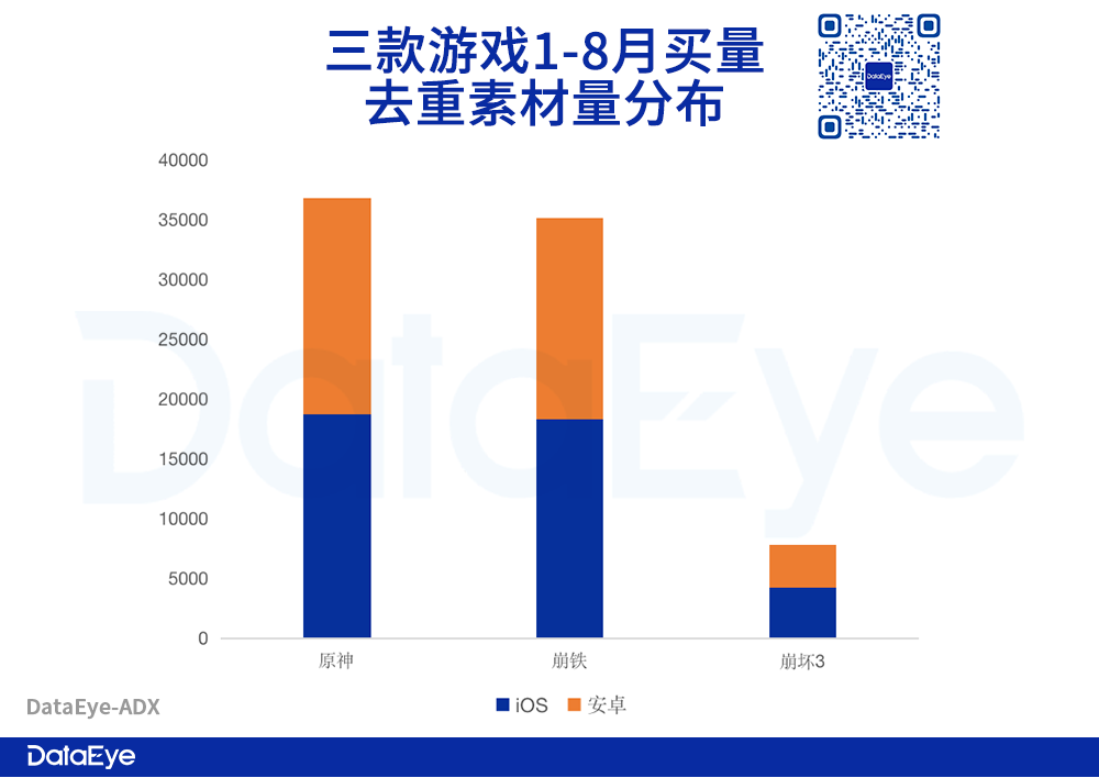 其三,米哈游今年获量的渠道,半数仍来自苹果,不可能离开App Store。DataEye-ADX数据显示:三款游戏今年1-8月去重后的买量素材数(创意数)双端占比如下: