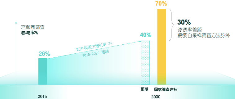此前,卫健委定下2030年适龄妇女宫颈癌人群筛查率达到70%以上,但如下图所示,受限于医疗资源等因素,我国宫颈癌筛查要想达预期目标,自采样方法不可或缺。