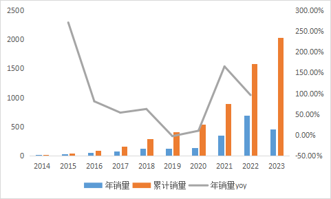 以中国为例,近十年里,我国新能源汽车的保有量增长迅速。2014年我国新能源汽车保有量仅为7.4万辆,而至2022年底已实现687.2万的年销量,1577.4万的累计销量,期间CAGR高达95.27%。