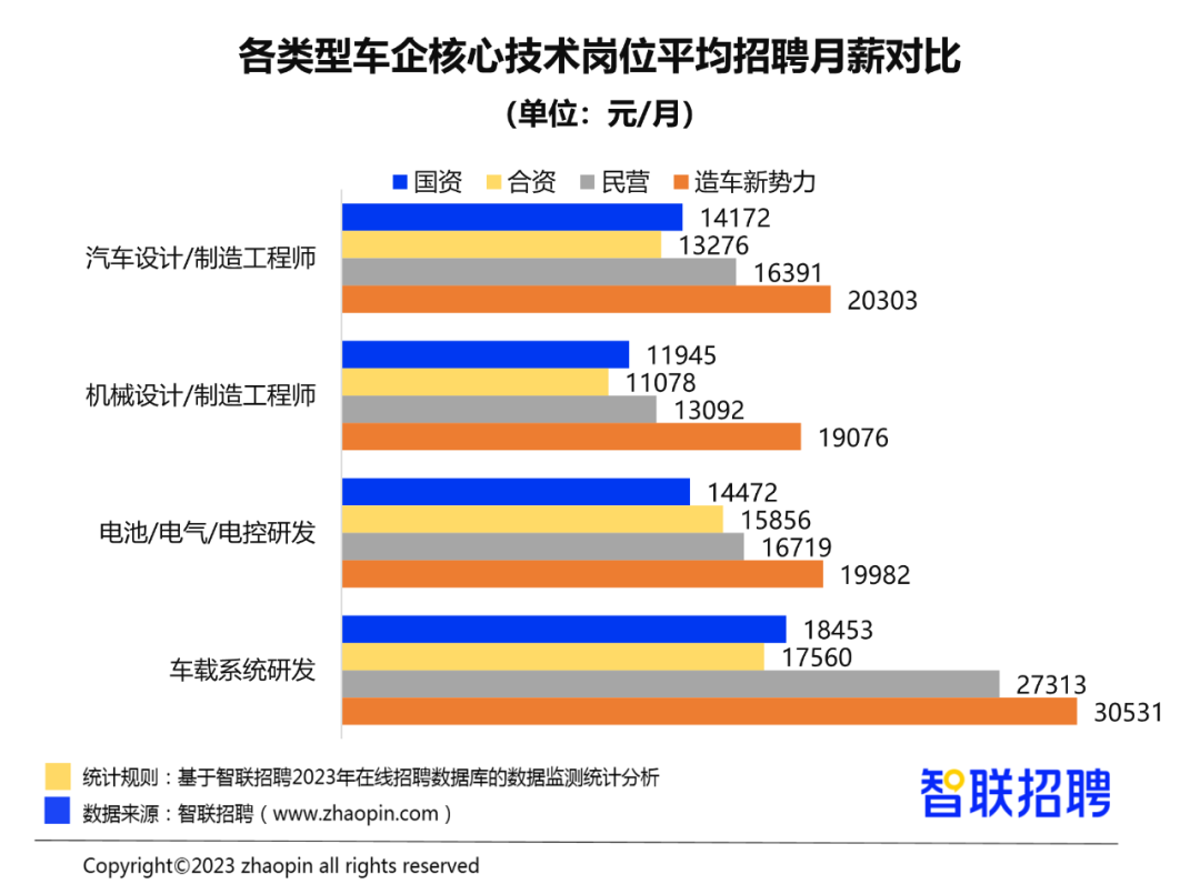 在薪酬方面,造车新势力企业因需求迅速占领市场和研发能力,因此更愿意高薪招聘具有丰富经验和专业技能的人才。具体数字来看,这些企业给车载系统研发岗位开出的月薪最高超过3万元,明显高于其他类型汽车制造商。