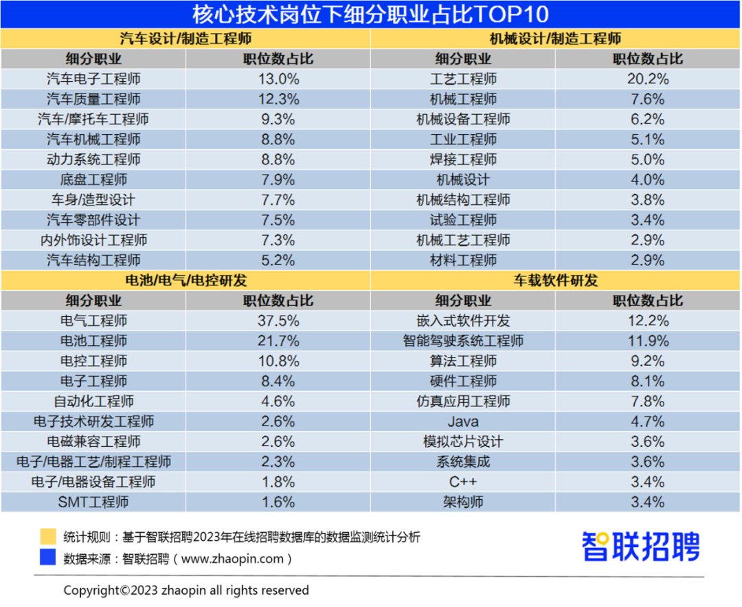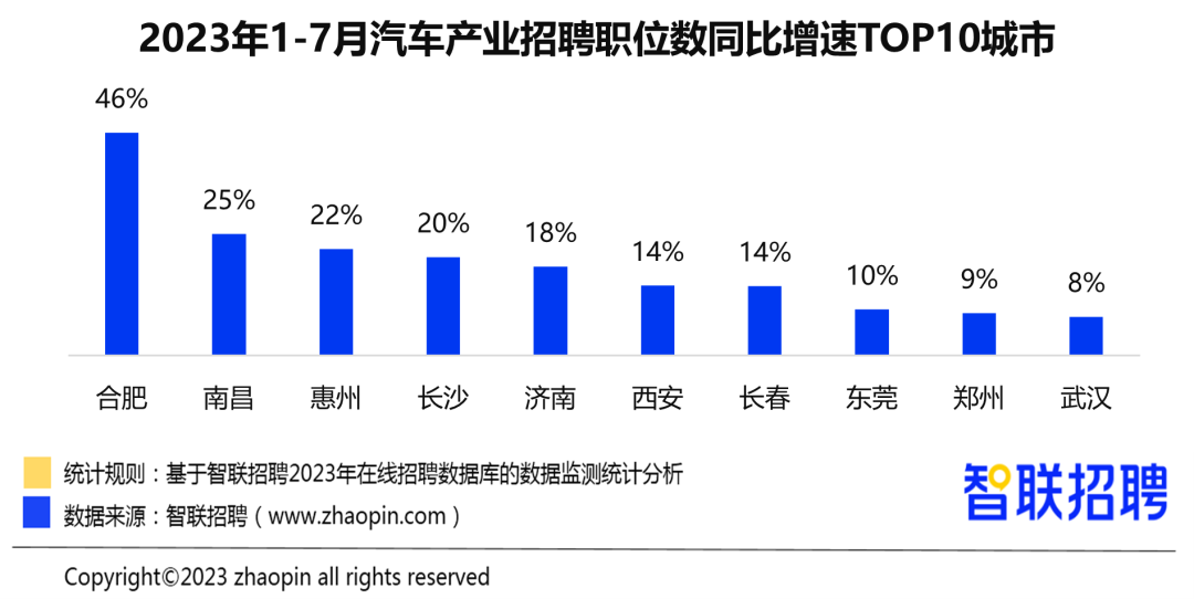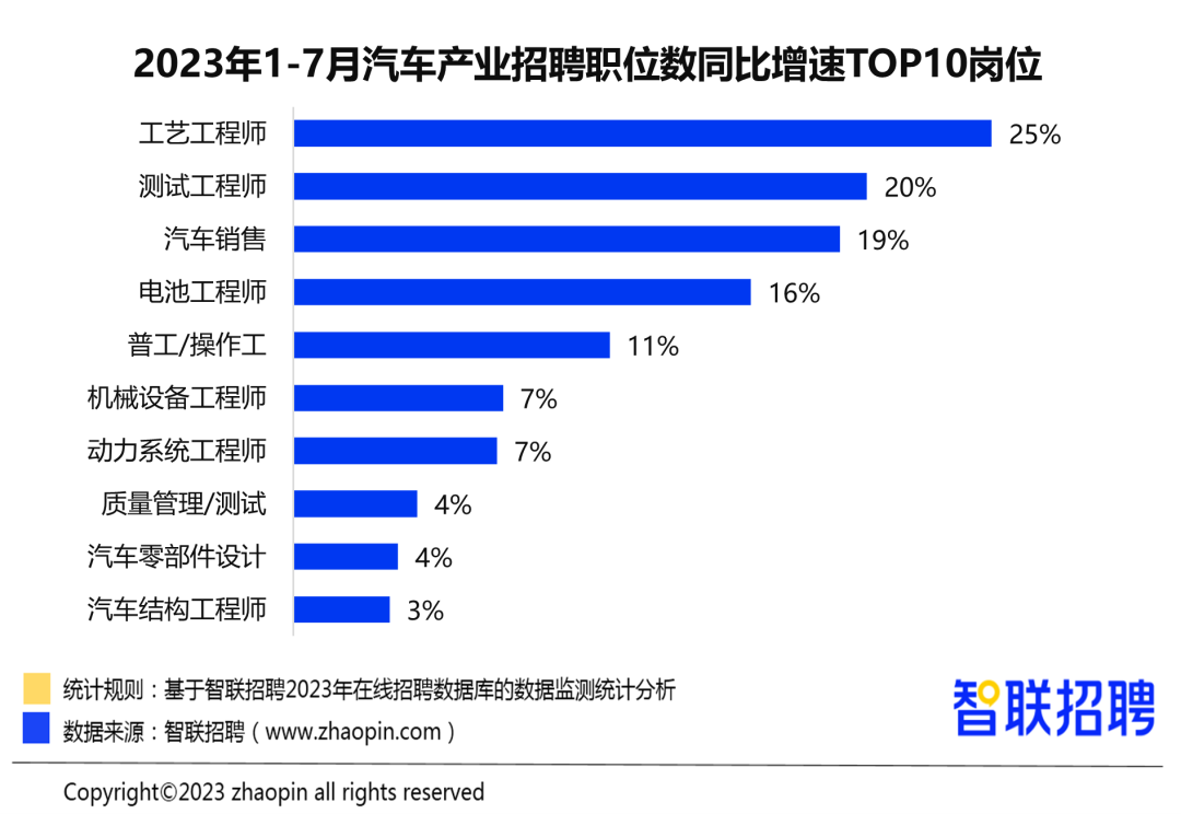 9月5日,中国电子信息产业发展研究院、智联招聘联合发布的《2023年汽车产业人才发展报告》显示,2023年1至7月,汽车产业招聘职位数同比增长6%,其中新能源汽车业务领域招聘职位数同比增长18%