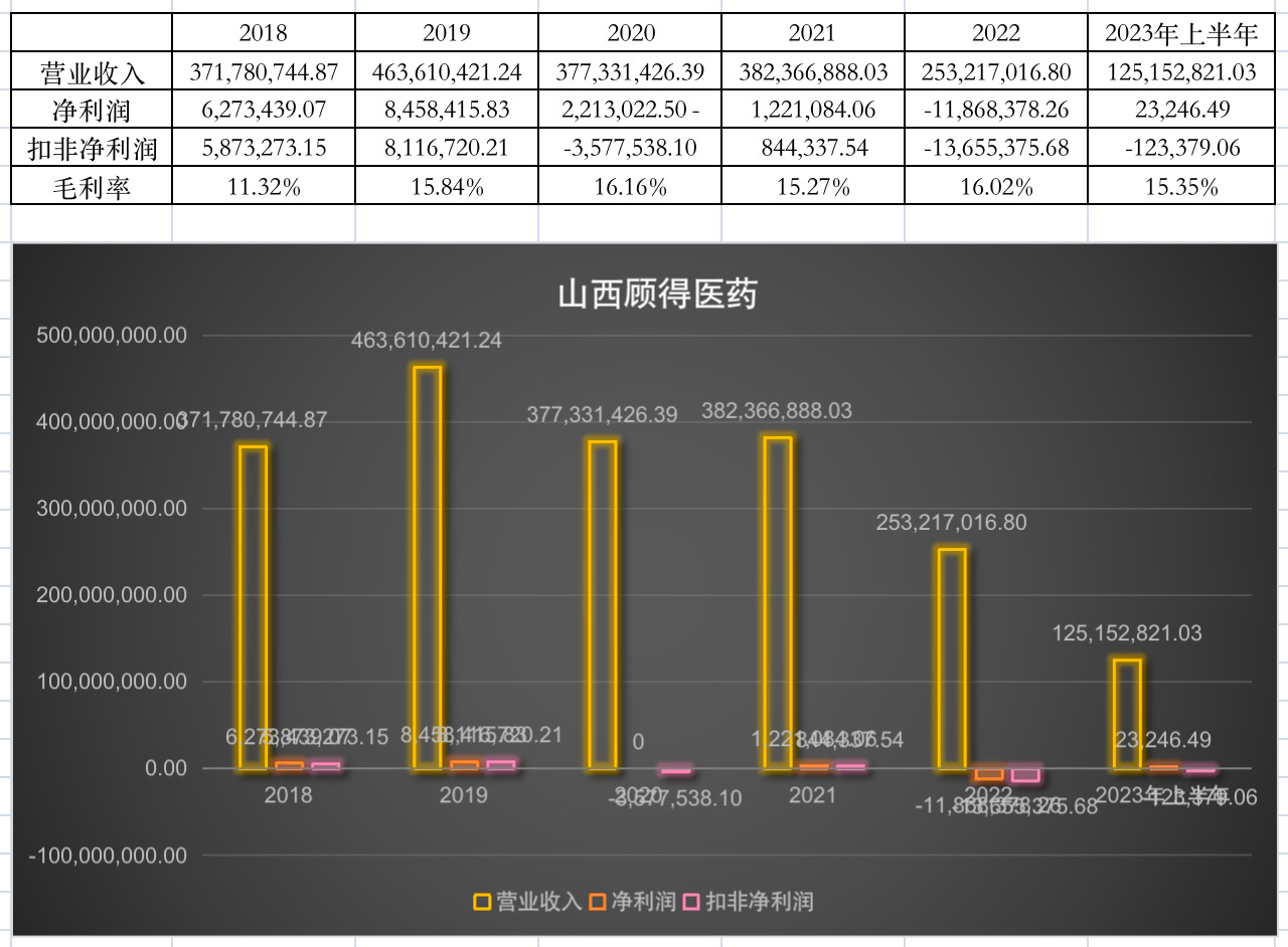 与官网披露的合作数据相比,山西顾得医药的业绩并不乐观,为逐年下滑态势。特别是,2022年起,山西顾得医药的扣非净利润已转为负数。在2023年上半年,山西顾得医药的净利润和否非净利润更是继续大幅度下滑,仅万元利润,分别为2.32万元和-12.33万元,同比下降99.59%和-102.35%。